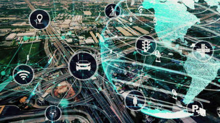 Smart transport technology concept for future car traffic on newish city road . Virtual intelligent system makes digital information analysis to connect data of vehicle on city street .