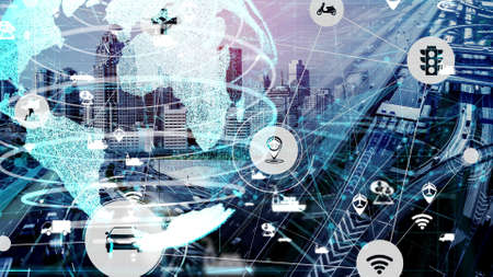3D illustration international communication and advanced internet network connect in smart city . Concept of international 5G wireless digital connection and internet of things future.