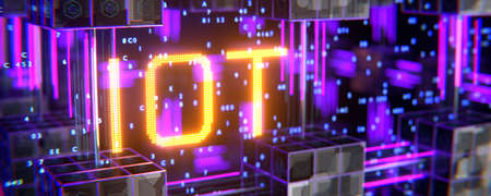 Orange inscription IOT on a digital background. Internet of things network concept. Internet of things concept. 3d rendering..