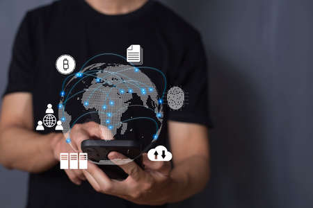 Businessman using smart phone to do online transactions with internet technology, concept of global data connection by internet technology, big data, searching for information, online marketing