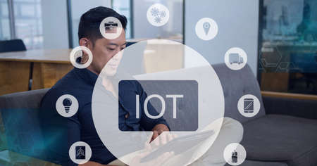 Composition of iot icon with network of connections over man using tablet. global internet of things connections, business, networking and digital interface concept digitally generated image.