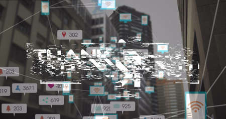 Image of thank you text, network of connections and numbers growing over cityscape. global social media, connections and digital interface concept digitally generated image.