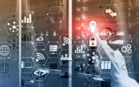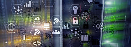 Digital concept internet of things information and telecommunication technology. Double exposure icons and server room background