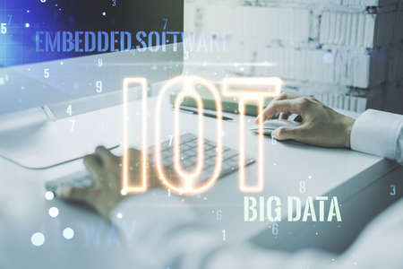 Creative IOT illustration with hands typing on computer keyboard on background, future technology concept. Multiexposure