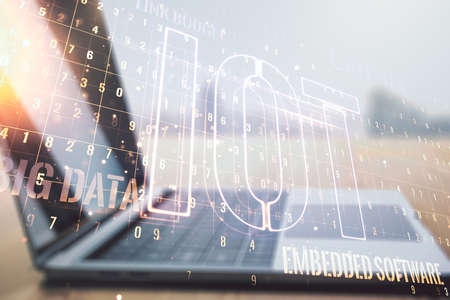 Creative IOT concept on modern laptop background. Multiexposure