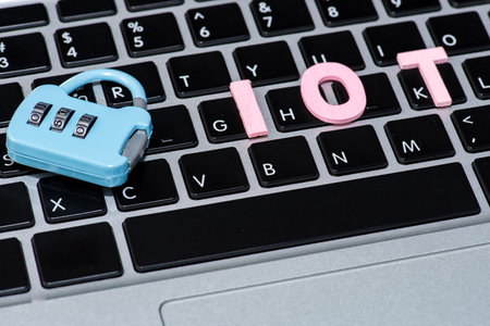 Side view of hands using laptop with IOT Internet of things concept on blurry background. Double exposure