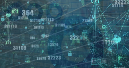 Image of network of connections with digital glowing icons moving on blue background. Digital interface global computer network concept digitally generated image.