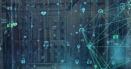 Image of network of connections with icons and data processing over server room. Global technology, computing and digital interface concept digitally generated image.