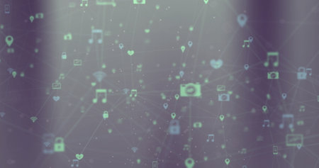 Image of network of connections with icons on grey background. Global connections, computing and digital interface concept digitally generated image.