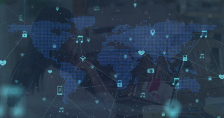 Image of network of connections and world map over caucasian woman using laptop. global connections, data processing and technology concept digitally generated image.