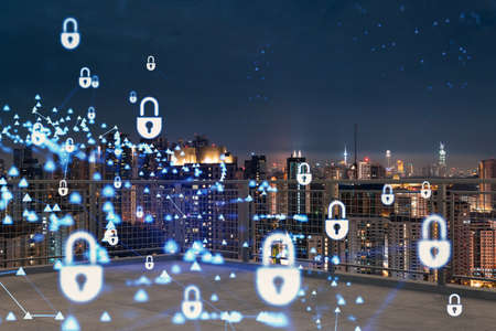 Rooftop with concrete terrace, Kuala Lumpur night skyline. Cyber security concept to protect clients confidential information. IT hologram padlock icons. City downtown. Double exposure.