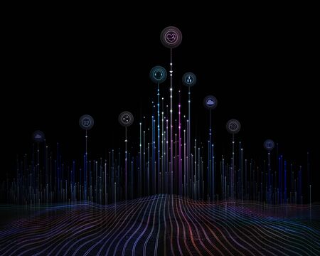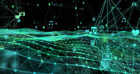 Digital background image with connection lines and icons on dark backdrop 3D rendering