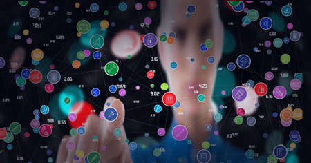 Financial data and social media icons over a woman, finances and technology concepts. digitally generated image