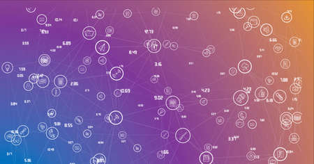 Composition of numbers and icons on yellow to purple background. global business, connections and technology concept digitally generated image.
