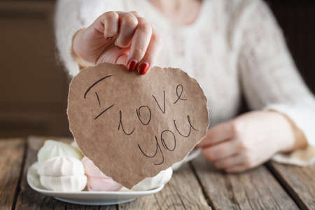 hand with red heart with the word I love you, on wooden background,