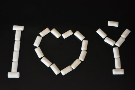 I love you written with white pills on black background, stock photo. Food, personal care products, product, chewing gum, white chewing pillows, chewing gum arranged on a black.