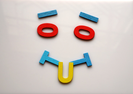 Happy face made from English alphabet letters are lined on white background with empty space.