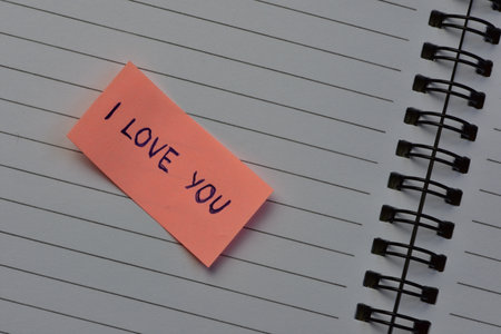 Message I love you on pink sticky note for valentines day on spiraled notebook open pages background