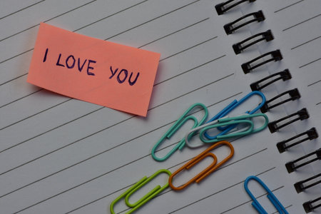Message I love you on pink sticky note for valentines day next to various color paper clips on spiraled notebook open pages background