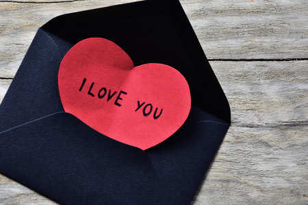 Message text I love you on red heart shape paper card for valentines day in small black envelope on wooden board textured background. Valentines day card with words I love you. Minimalist valentines day greetings.