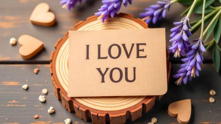 Rustic card with I Love You in elegant text on wooden slice with and beige heart accents, surrounded by fresh lavender. Perfect for romantic gestures, heartfelt gifts, or love-themed campaigns