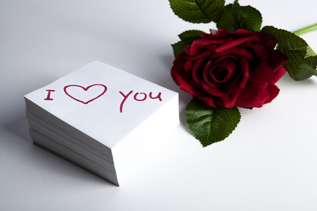 notebook with marker inscription I love you and rose on white