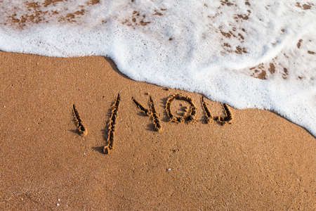 Inscription of I love you written on wet yellow beach sand. Concept of celebrating the St. Valentine's day at some exotic place