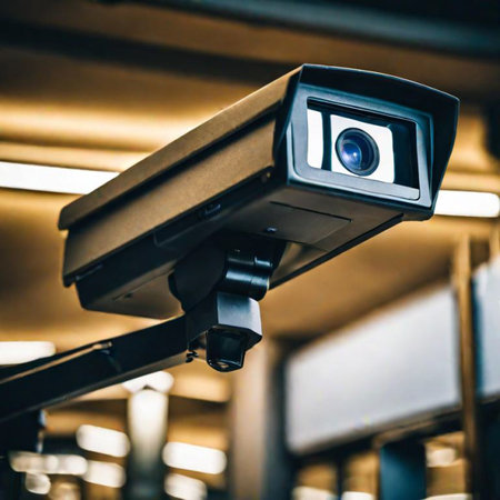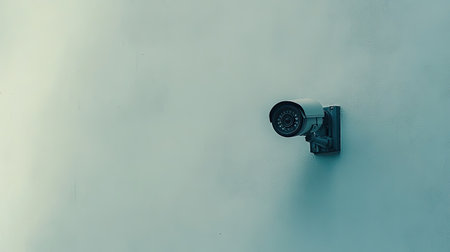 A color photo of an AI-powered security camera mounted on a wall, ensuring constant surveillance and protection. The sleek design and advanced technology highlight its efficiency in monitoring spaces. Copy space is present