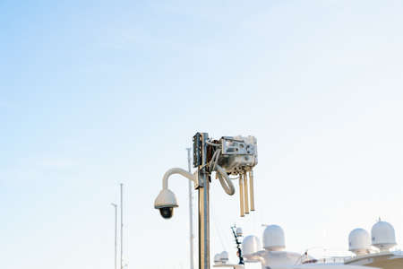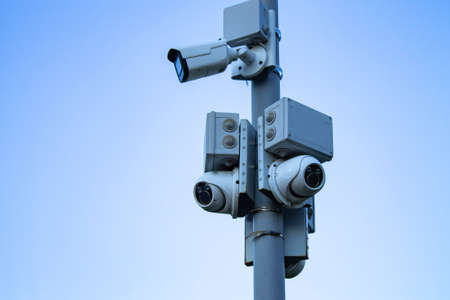 Modern CCTV security system on sky background Smart camera theft protection.
