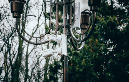 White surveillance camera hanging on a pole. The camera watches the order in the streets and in the parks. Camera on a post in a park. Side view and straight