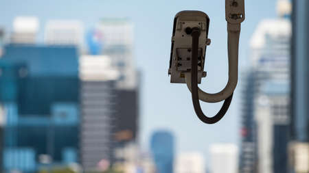 CCTV surveillance security camera video (VDO) equipment in city for safety system area control outdoor with copy space for text. Secure urban town with modern buildings background.