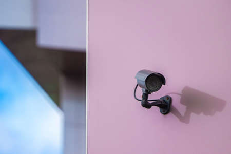 CCTV security camera on pink wall in modern city. Security system and monitoring concept. Copy space.