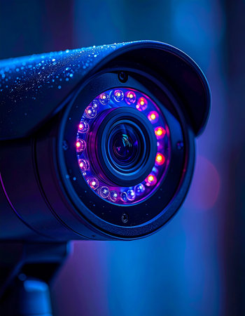 In the cool, rain-slicked night, a futuristic security camera keeps a vigilant watch. Its glowing infrared LEDs pierce the darkness, a symbol of modern protection, data collection, and the ever-present eye of technology monitoring the silent city.