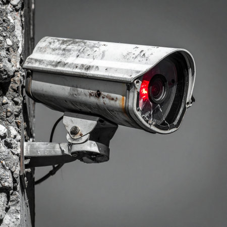 A weathered security camera is installed on a rusty industrial wall in an urban setting.