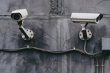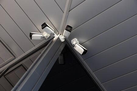 Panorama of multiple security cameras installed on the exterior wall of a building, generative AI illustration