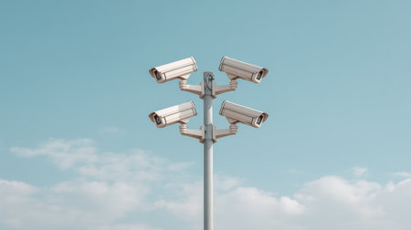 A tall pole displays multiple surveillance cameras against a backdrop of a clear blue sky, offering high-tech monitoring solutions for enhanced security and safety.