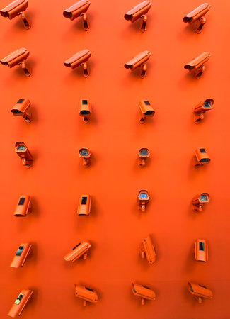 Vertical colorful image of a large symmetrical group of CCTV cameras mounted on an orange wall