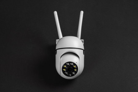 Modern outdoor wifi CCTV camera on dark background close up