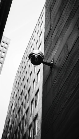 A monochromatic view of a cctv camera positioned on a building corner, its lens directed towards the bustling city street below. the geometric architecture of surrounding buildings enhances the urban surveillance theme.