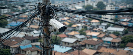 CCTV security camera on electric pole with cityscape background in Thailand