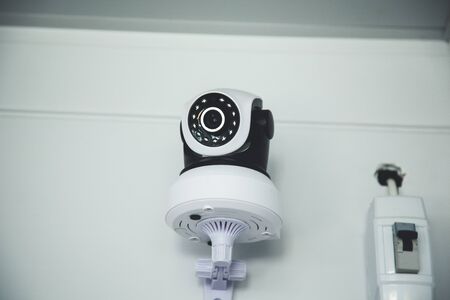 Close up with a white security surveillance camera. CCTV camera on a wall.