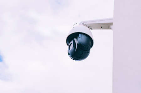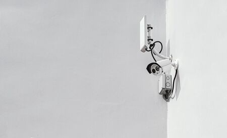 White CCTV security camera on the wall in the city street.