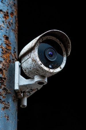Weathered security camera on a dark background