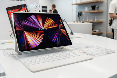 New Apple Computer iPad Pro with pencil and Apple Magic Keyboard is installed at Apple Store for customers to view and trial. Minsk, Belarus, July 17, 2023