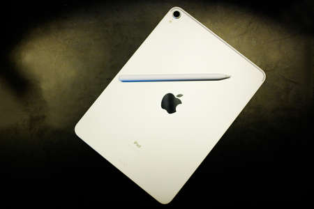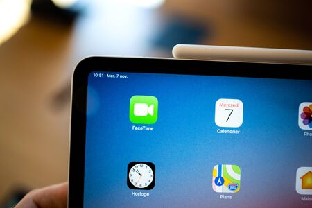 PARIS, FRANCE - NOV 7, 2018: Customer POV personal perspective experiencing new Apple iPad Pro tablet with Apple Pencil charging on the side