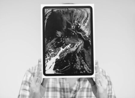 Paris, France - Oct 28, 2022: Black and white image Male hand close-up of new Apple Computers iPad 10th generation in store - looking at the rear camera