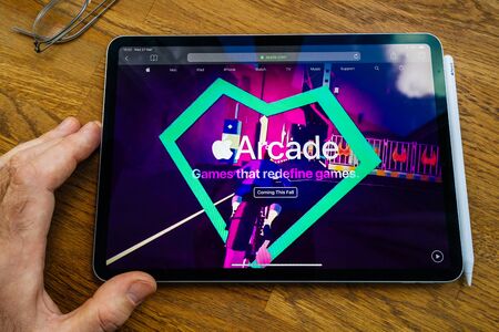 Paris, France - Mar 27, 2019: POV personal perspective on Apple Arcade webpage seen on modern iPad Pro tablet featuring the new subscription model - games that redefines games