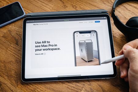Paris, France - Jun 6, 2019: Man reading on Apple iPad Pro tablet about latest announcement of at Developers Conference WWDC - Mac Pro workstation with USE ar to see Mac Pro in your workspace