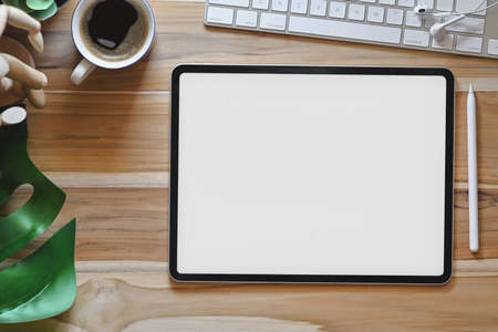 Top view of modern workplace with comfortable workplace with blank screen tablet on wooden table