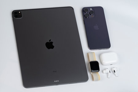 New york, USA - November 8, 2022: Portable Apple gadgets layout ipad, iphone, watch and earphones lay on white background